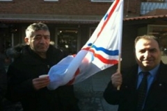 والعلم الأشوري اضافة الى العلم السويدي , وألقيت كلمات منددة بوحشية جرائم النظام