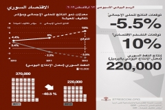 توقعات بانكماش الاقتصاد السوري هذا العام: في تقريرها السنوي حول التطورات الاقتصادية والاجتماعية لدول غرب آسيا توقعت اللجنة الاقتصادية والاجتماعية لغرب آسيا والتابعة للأمم المتحدة انخفاض الناتج المحلي الإجمالي السوري بمعدل 5.5 بالمائة هذه السنة مقارنة بـ 3.1 بالمائة في عام 2011، بينما توقع البنك العالمي انكماشاً أكبر بمعدل 6.4 بالمائة. وكانت سورية هي الدولة الوحيدة التي سجلت نتائج سلبية من بين 14 دولة شمتلهم الدراسة. وتوقعت الدراسة أيضاً أن ينخفض معدل الإنتاج اليومي للنفط ليصل إلى 220,000 برميل مقارنة بـ 370,000 برميل يومياً خلال العام الماضي وذلك بسبب توقف صادرات النفظ إلى أوروبا بشكل تام نتيجة للعقوبات الاقتصادية الأوروبية التي استهدفت قطاعَي النفط والبنوك