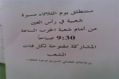 سري كانيه – راس العين و جاء فيها "ستنطلق يوم الثلاثاء مسيرة شعبية في رأس العين من أمام شعبة الحزب الساعة 9.30